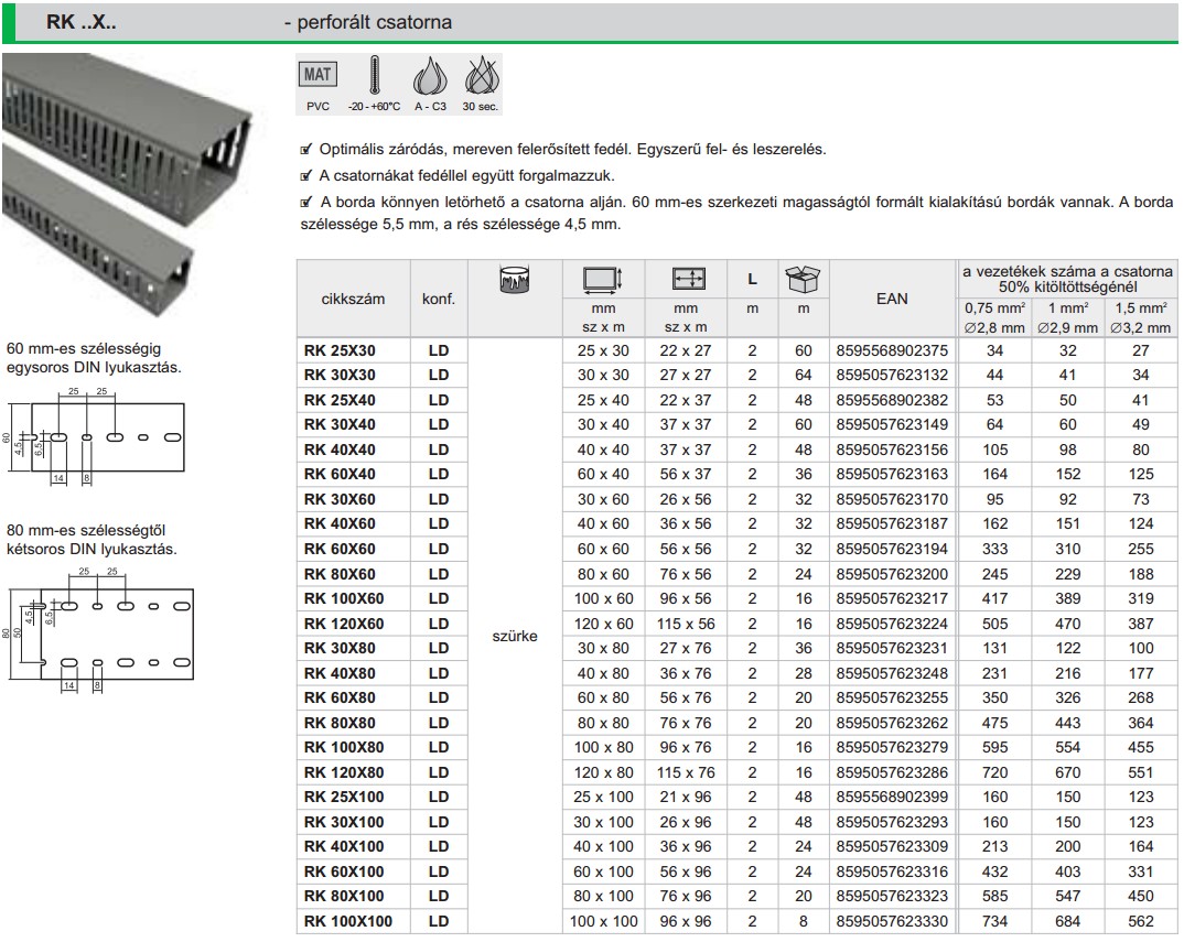 Kcs 80x100 mm perforált csatorna szürke 2m/szál RK 80X100 LD Kopos | |