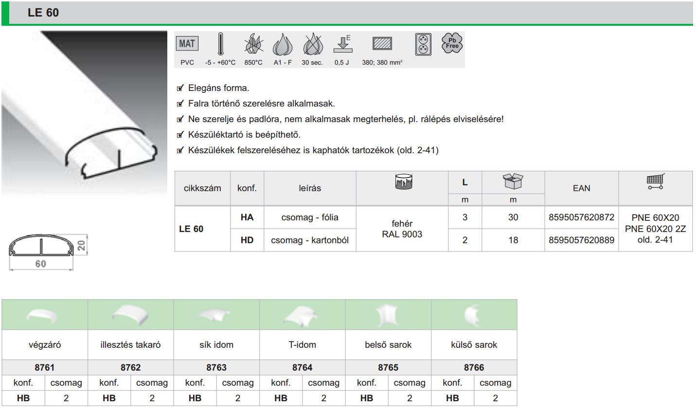 Kcs 60x20mm kábelcsatorna fehér 2m/szál LE 60 HD Kopos | |