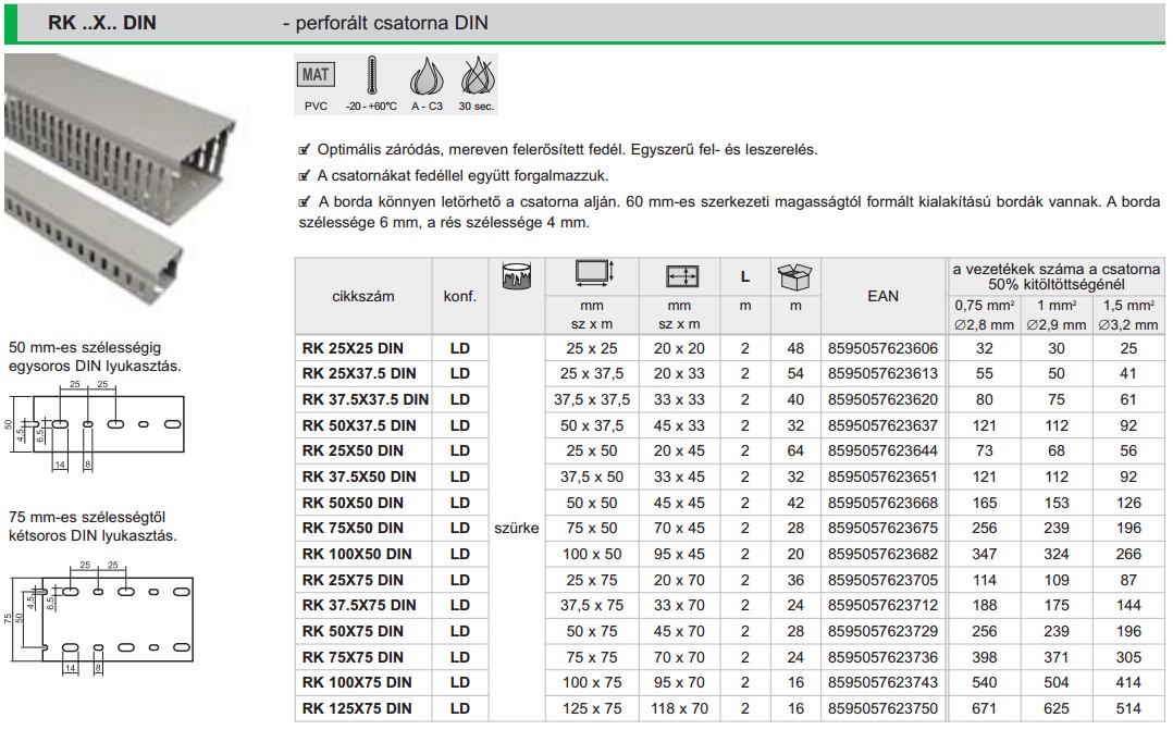 Kcs 50x50mm perforált csatorna szürke 2m/szál RK 50X50 DIN LD Kopos | |